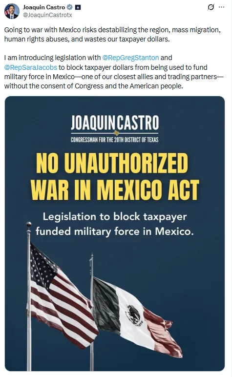 La iniciativa, denominada No Unauthorized War in Mexico Act (Ley de No a una Guerra No Autorizada en México), fue promovida por los congresistas del bloque demócrata Joaquín Castro, Sara Jacobs y Greg Stanton.