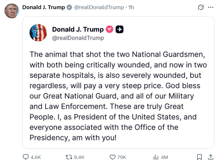 “El animal que disparó a los dos Guardias Nacionales, ambos gravemente heridos y ahora en dos hospitales separados, también está gravemente herido, pero a pesar de todo, pagará un precio muy alto. Dios bendiga a nuestra Gran Guardia Nacional y a todos nuestros Militares y Fuerzas del Orden. Esta es gente verdaderamente grande. ¡Yo, como Presidente de los Estados Unidos, y todos los asociados con la Oficina de la Presidencia, estamos con ustedes!”.
